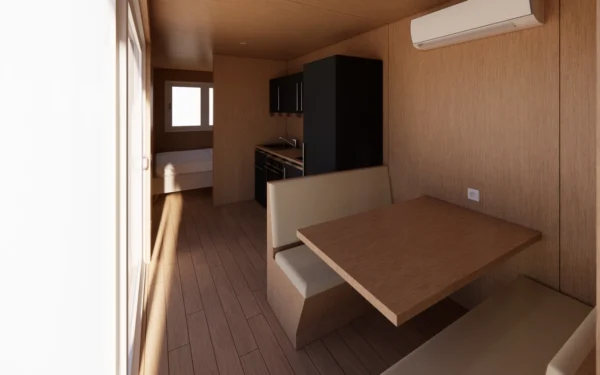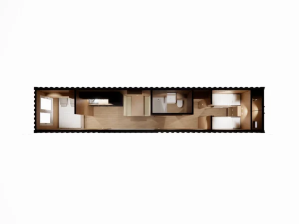 Conteneur maritime 40 pieds transformé en un lieu de vie fonctionnel et confortable. Espace de vie de presque 28m² idéal pour un couple avec enfants (6 couchages). Entièrement meublé, avec de nombreux rangements. Cuisine sur-mesure et équipée. Salle de bain avec douche, meuble vasque, WC. Confort toute l’année grâce à une PAC réversible. Isolation par l’intérieur performante. Installation rapide. Couleur au choix.